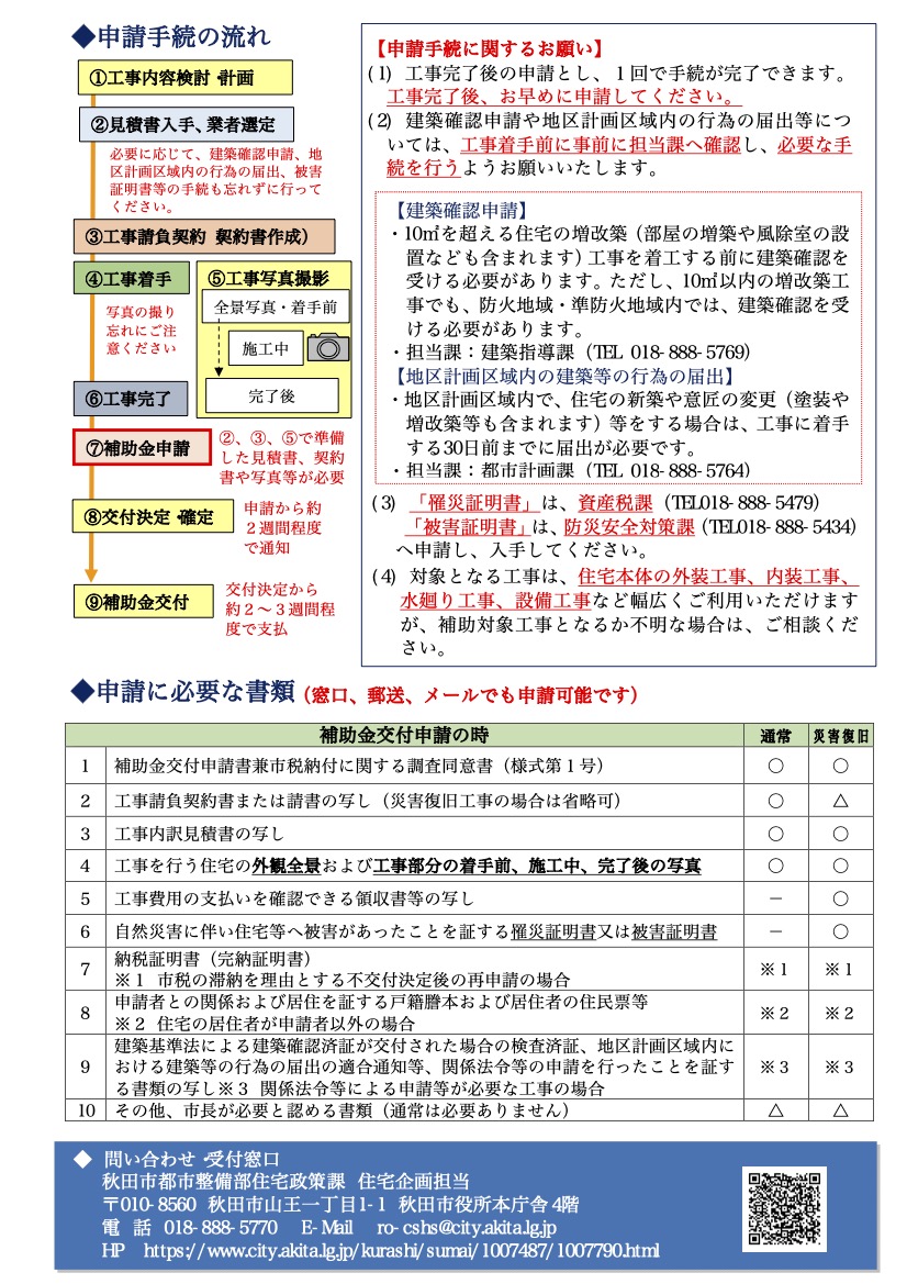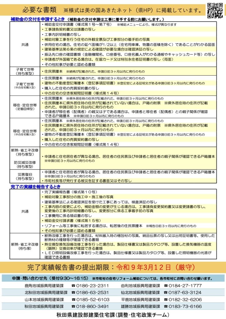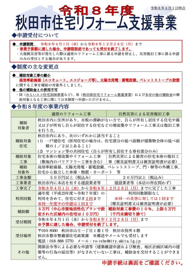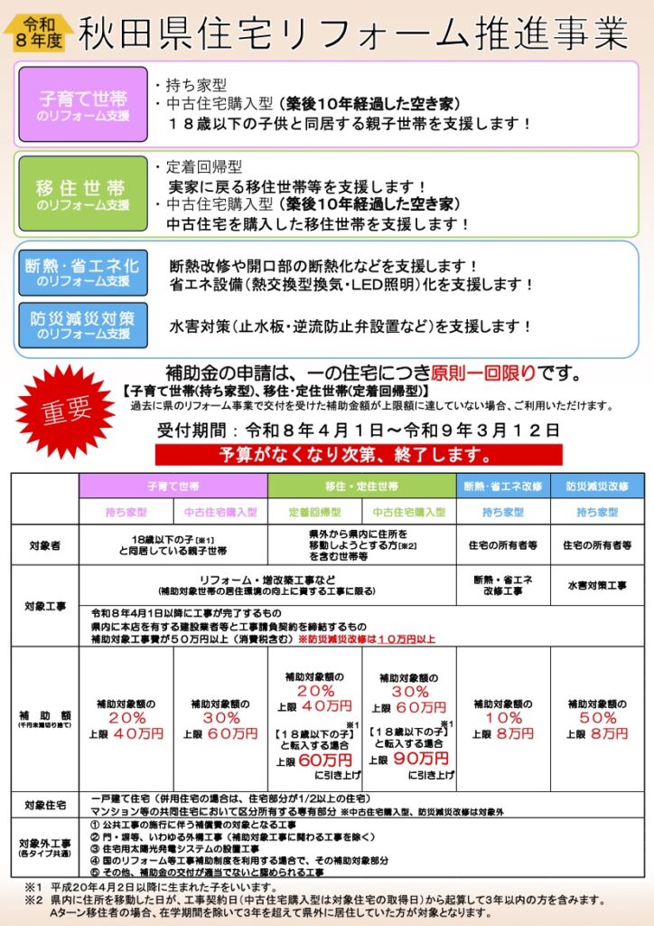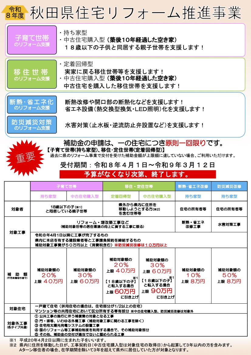 令和8年度の秋田県と秋田市のリフォーム補助の要項がリリースされました。 下記に秋田県・秋田市のリリースされた要項をご確認ください。 当社の施工をいただいたお客様には申請代行のサービスで行っておりますので、ご不明点なども含めてお気軽にお問い合わせいただければと思います。 秋田県リフォーム補助 秋田市 未分類 よかったらシェアしてね! URLをコピーしました! かだん4月号に広告が掲載されました 関連記事 かだん4月号に広告が掲載されました 2026年3月30日 冬季のお休みについて 2025年11月29日 秋田市外旭川Y様邸 施工スタートしました 2016年5月9日 広告が掲載されました エークラス・かだん4月号 2016年3月29日 広告が掲載されました 7月号 エークラス・かだん 2015年6月29日 かだん3月号に広告が掲載されました 2015年2月26日 ホームページ公開 2015年2月9日