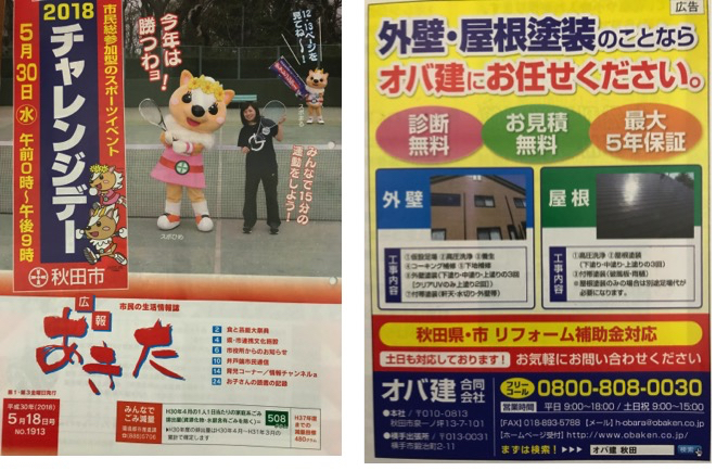 秋田市の広報誌 ”広報あきた"に当社の広告が掲載されました。 外壁塗装・屋根塗装お考えの皆様、出張診断・お見積もりは無料で行ってますので、お気軽にお問い合わせく... -