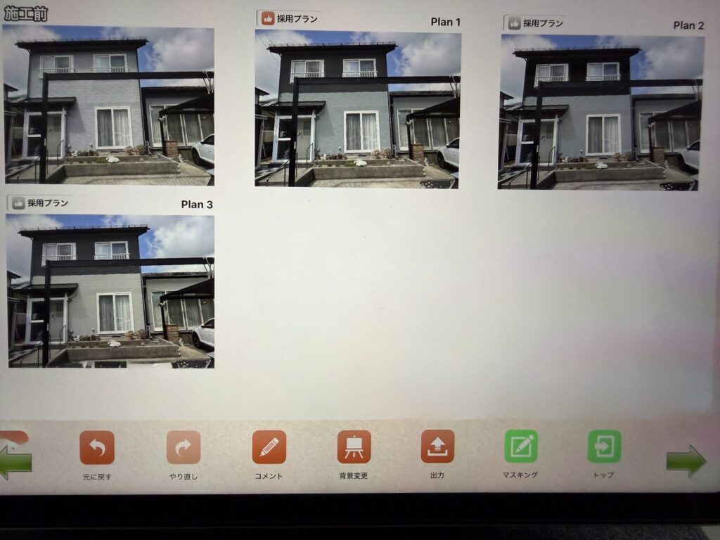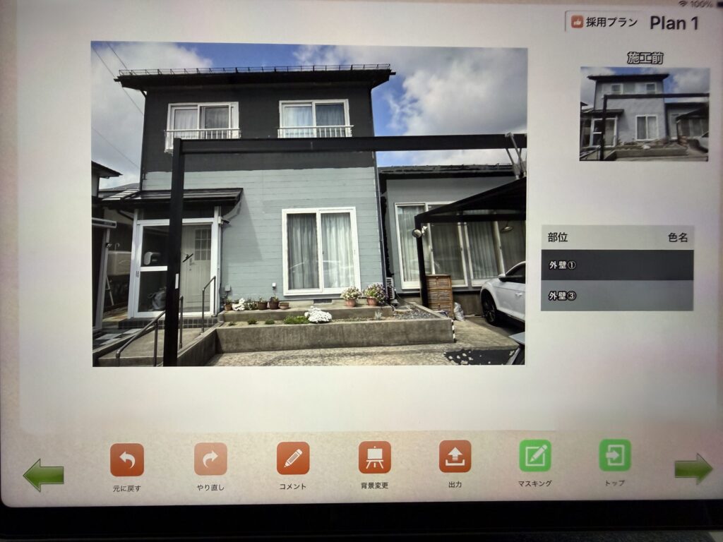 前回10年前に施工した際とはイメージを変えて2階を濃いめの色、1階を明るめの色の2トーンにしたいとのご希望でしたので、カラーシュミレーションにてイメージしやすいようにご提案させていただきました。